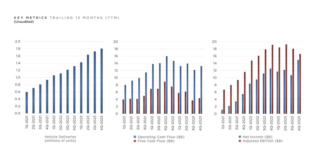 不过特斯拉的现金储备还是很丰厚的,2023年度营运现金流为133亿美元,2023年度自由现金流为44亿美元。其中,第四季度营运现金流为44亿美元,第四季度自由现金流为21亿美元。