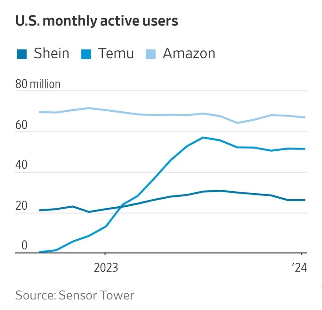 Amazon、Temu、Shein 在美国每月活跃用户数