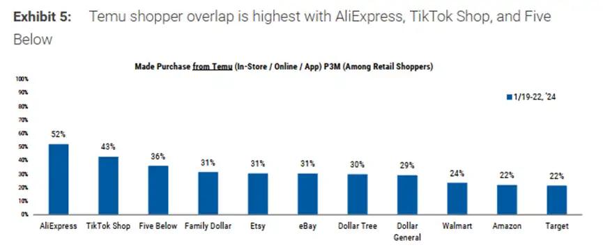 根据大摩的数据,Temu用户与其他平台的重叠程度最高的是阿里速运通、TikTok Shop 和 Five Below。根据AlphaWise数据,52%的速运通购物者也使用Temu,而TikTok Shop和Five Below的用户比例分别为43%和 36%。重叠程度最低的反而是大型零售商,像是沃尔玛、亚马逊和塔吉特。