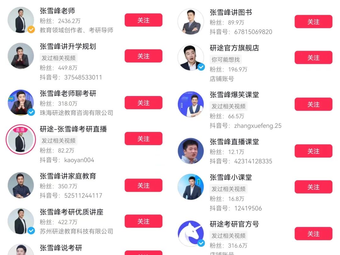实际上,在平台搜索“张雪峰”,主账号外还有诸多矩阵账号,共享着张雪峰的IP效应。如@张雪峰讲升学规划、@张雪峰讲家庭教育、@张雪峰考验优质讲座 3个账号,2023年的年度涨粉均超过百万,位列TOP1000抖音年度涨粉榜。而这类账号实际运营人员是张雪峰的团队,视频内容多出自于其直播间,也会通过连麦的方式指导志愿填报。