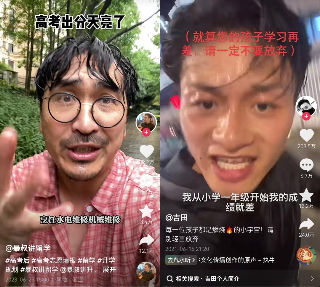 互联网上还流传这样一种说法:顺境张雪峰,逆境吉田,绝境暴叔。三位“人生导师”各司其职,引领升学规划。主打“专升本”规划的吉田风格就是“狂飙流”:一面全力奔跑,一面疾言厉色反复强调,“你必须专升本!你必须专升本!你明明可以考上本科的!却偏偏考上专科!你是不是非常不服气!你先读个专科去,按照我的方法来,你一定可以升入本科!”鸡汤灌溉+奔跑打气,让吉田在抖音积累了超875万粉丝。