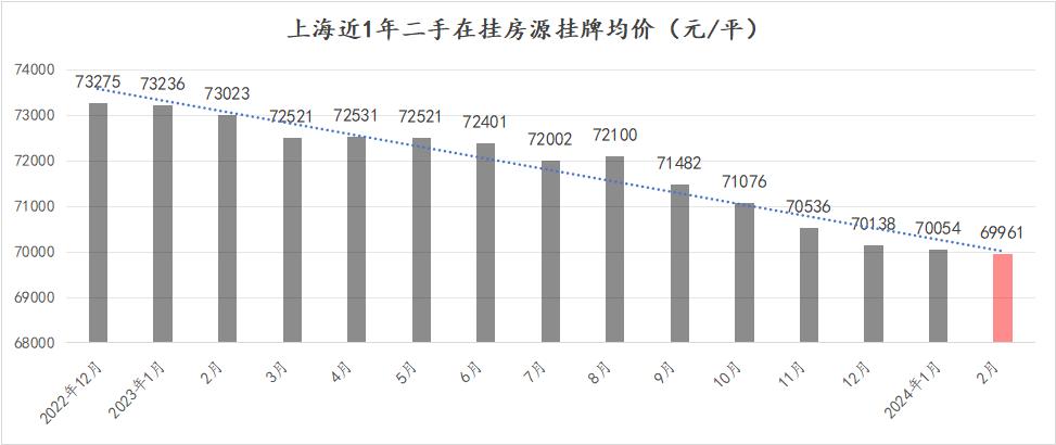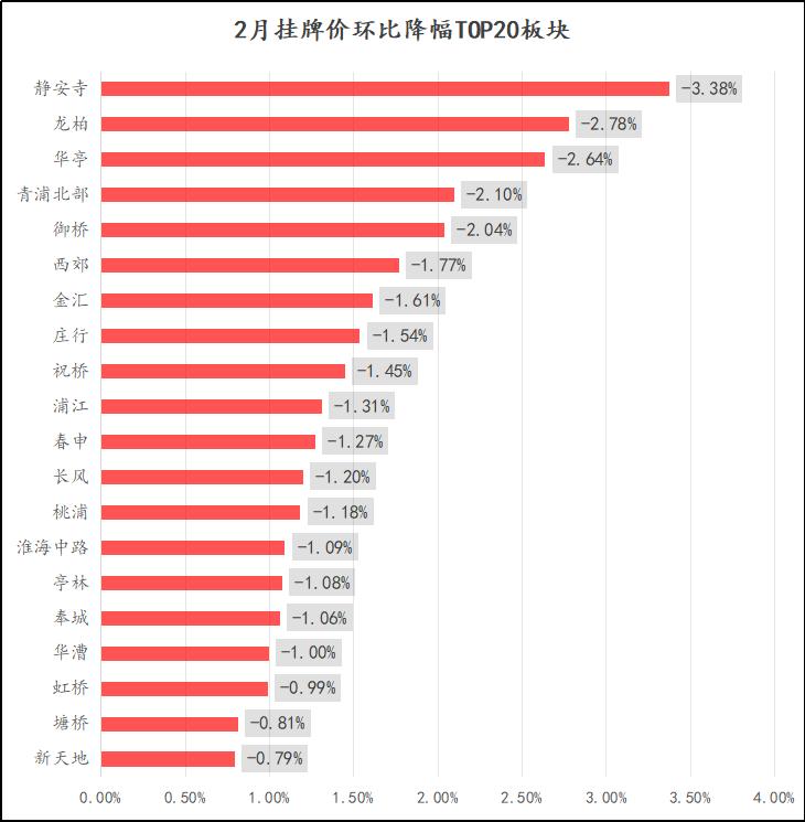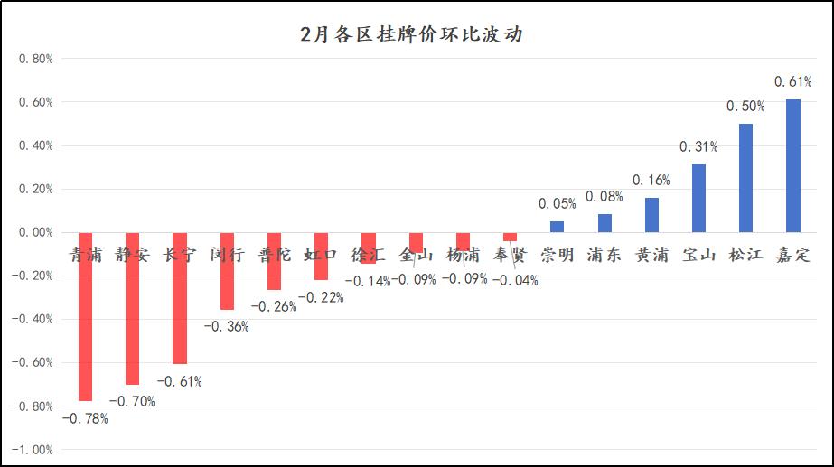 几个区里面2月挂牌价环比降幅最高的分别是 青浦、静安、长宁、闵行。