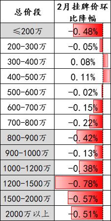 挂牌价降幅最大的价格段分别是≤200万的, 另外就是800-2000万以上的 。