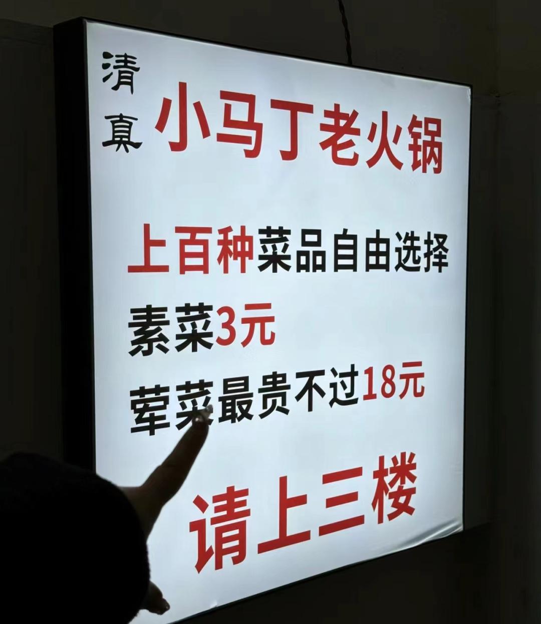 三是西安的小马丁老火锅,引导招牌上直接写着:上百种菜品自由选择,素菜3元,荤菜最贵不过18元,在自选区竟然还设置了很多“1元菜品”。