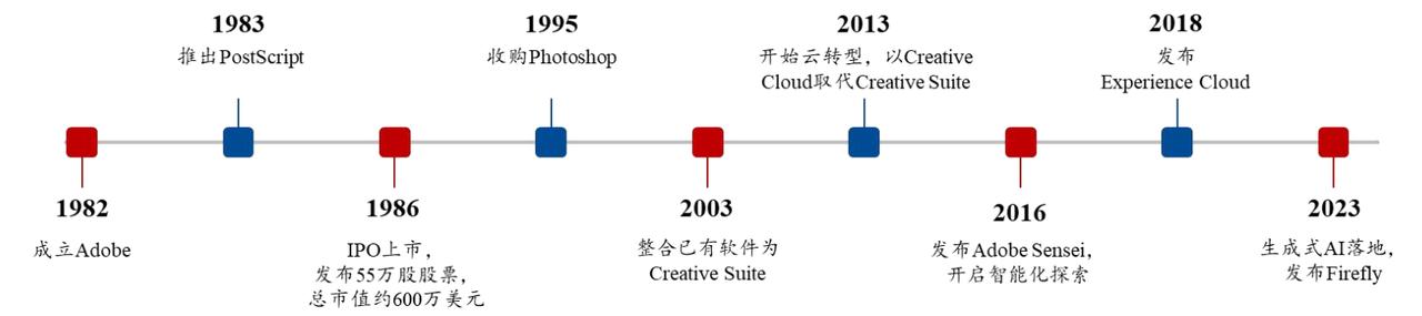 Adobe 自印刷编程语言 PostScript 起家,发展历程主要包括三个关键节点: