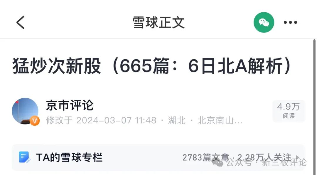 上周,665篇北A解析文的标题是“猛炒次新股”,列举了春节之后,次新股板块表现强劲,尤其是$坤博精工(BJ873570)$在2月26日、27日及28日连续3个30cm涨停,前两个强封第3个涨停炸板,2月27日捷众科技涨停,3月6日莱赛激光涨停。
