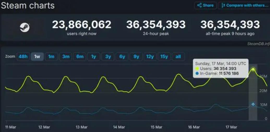 截至3月18日,据 SteamDB 数据显示,Steam 同时在线玩家峰值人数达到 36354393,连续三周创造新的纪录。3月2日,在线峰值34298950人,3月10日这个纪录被刷新至35385530人。