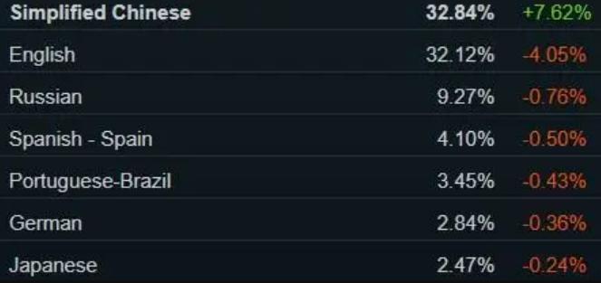 2月份Steam有个标志性事件。根据其发布的2024年2月软件及硬件调查报告,简体中文用户占比单月暴涨7.62%,创历史最大单月涨幅。同时,简中用户取代英语用户,成为Steam占比最高的玩家群体。