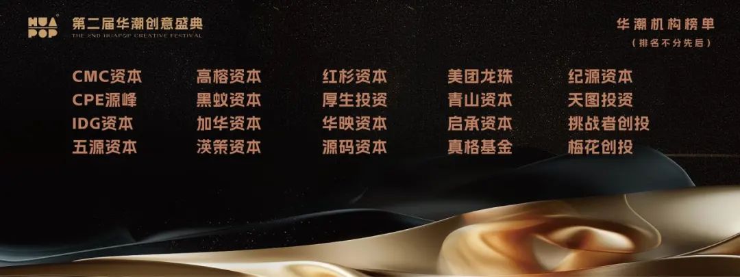 第二届华潮创意盛典根据华潮与36氪研究院携手合作开发的华潮AI数据库,综合遴选出在华潮文化领域拥有突出地位和活跃资产管理记录的创业投资暨私募股权市场投资机构及投资人。