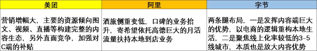 图:美团、阿里、字节本地生活资源侧重表述,来源:锦缎研究院