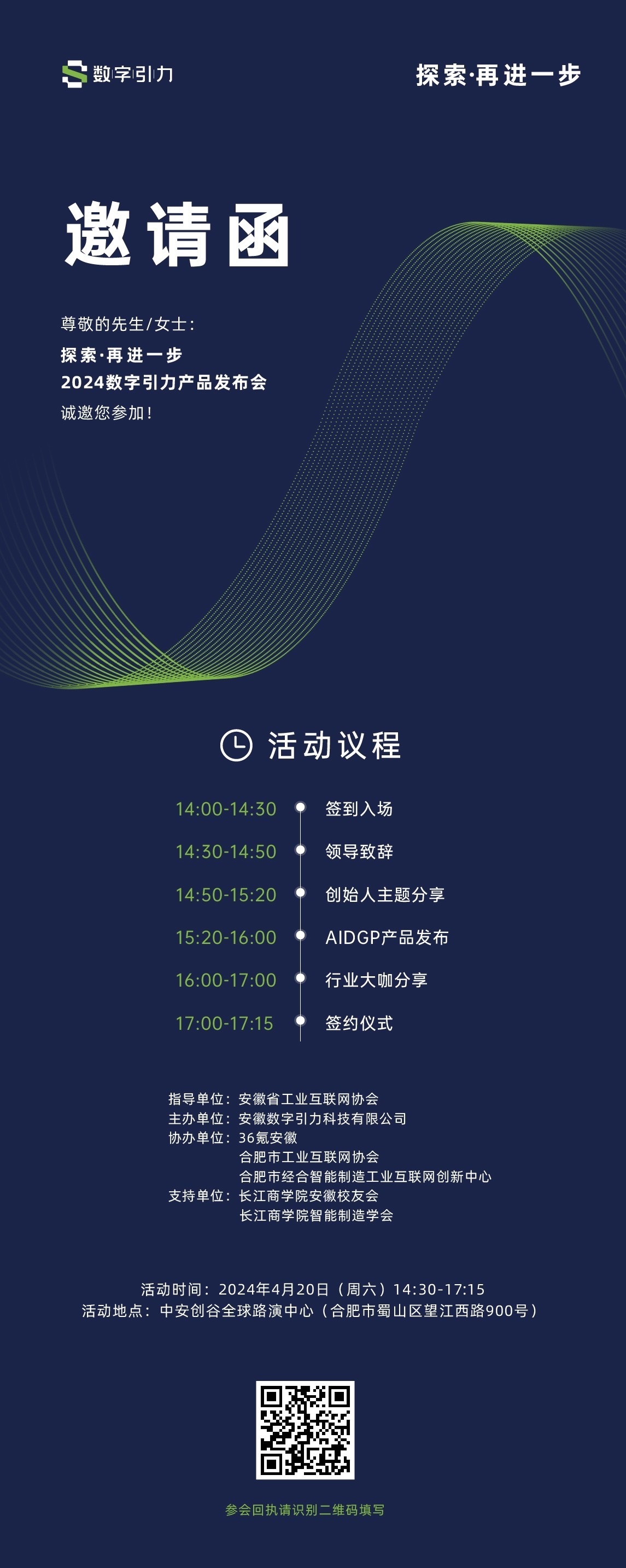 站在新的起点上!4月20日,以“探索,再进一步”为主题的2024数字引力产品发布会将在合肥市中安创谷全球路演中心召开,本次大会,数字引力将做基于大语言模型驱动下的自动编程AIDGP的产品发布。同时,数字引力将邀请客户与数字化领域具有影响力的专家、商业领袖、投资机构、合作伙伴等齐聚一堂,共同探讨如何让AIDGP为中国企业数字化转型提供新模式与新动力。