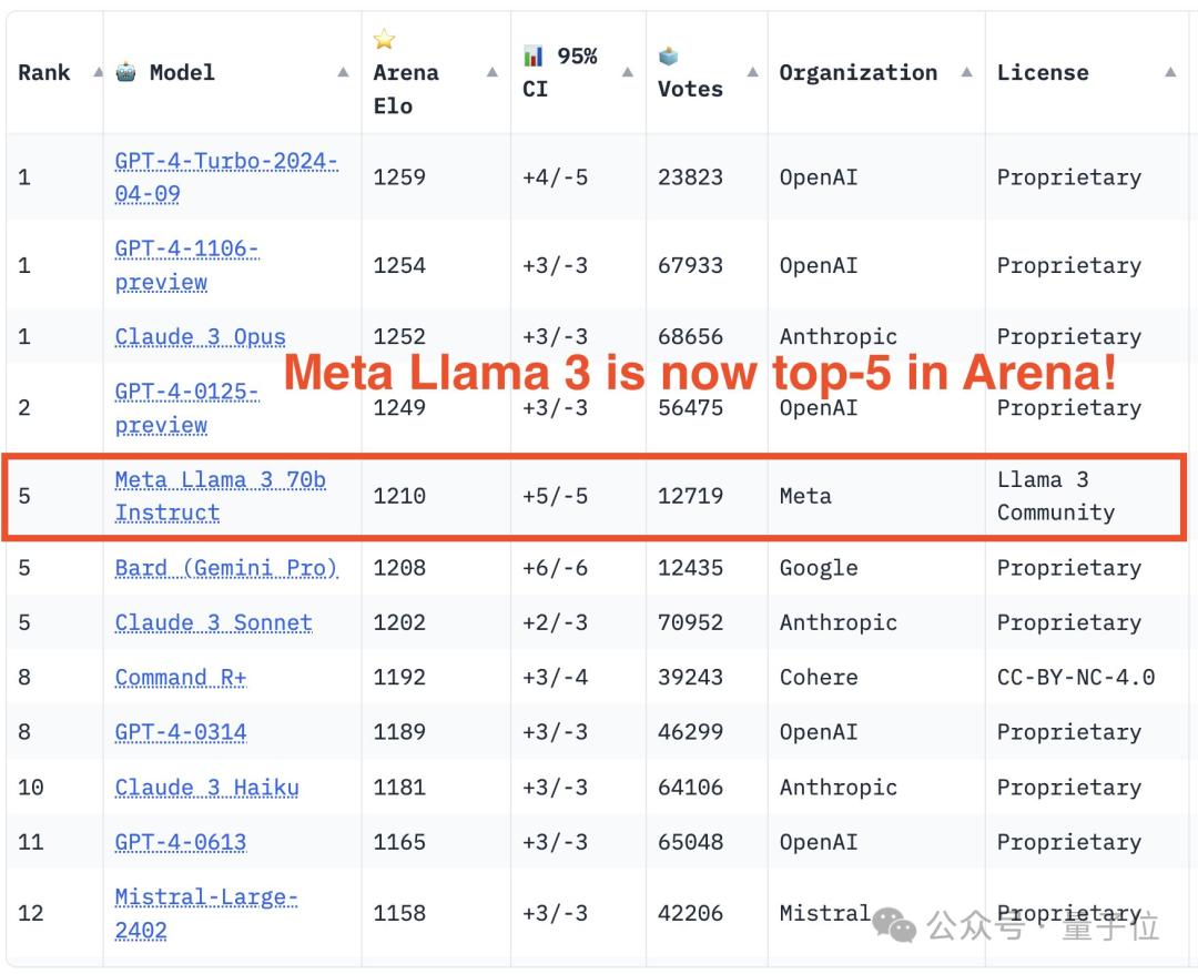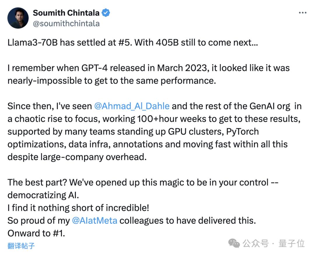 Llama 3的400B版本还没出来,单靠70B参数就获得了第五名……我还记得去年三月GPT-4发布的时候,达到与之相同的表现几乎是一件不可能的事。……现在AI的普及化实在是令人难以置信,我对Meta AI的同仁们做出这样的成功感到非常骄傲。