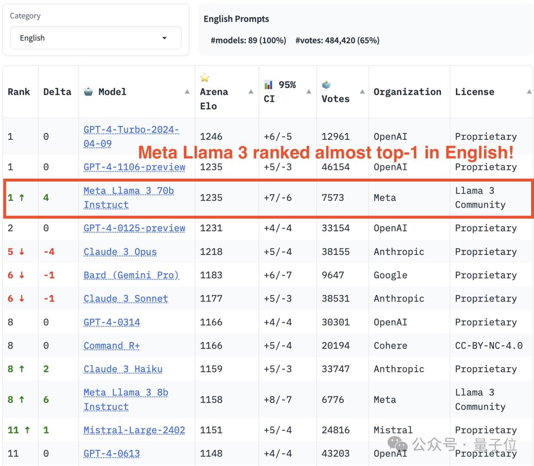 而在英文单项榜单中,Llama 3反超了Claude,与GPT-4打成了平手。