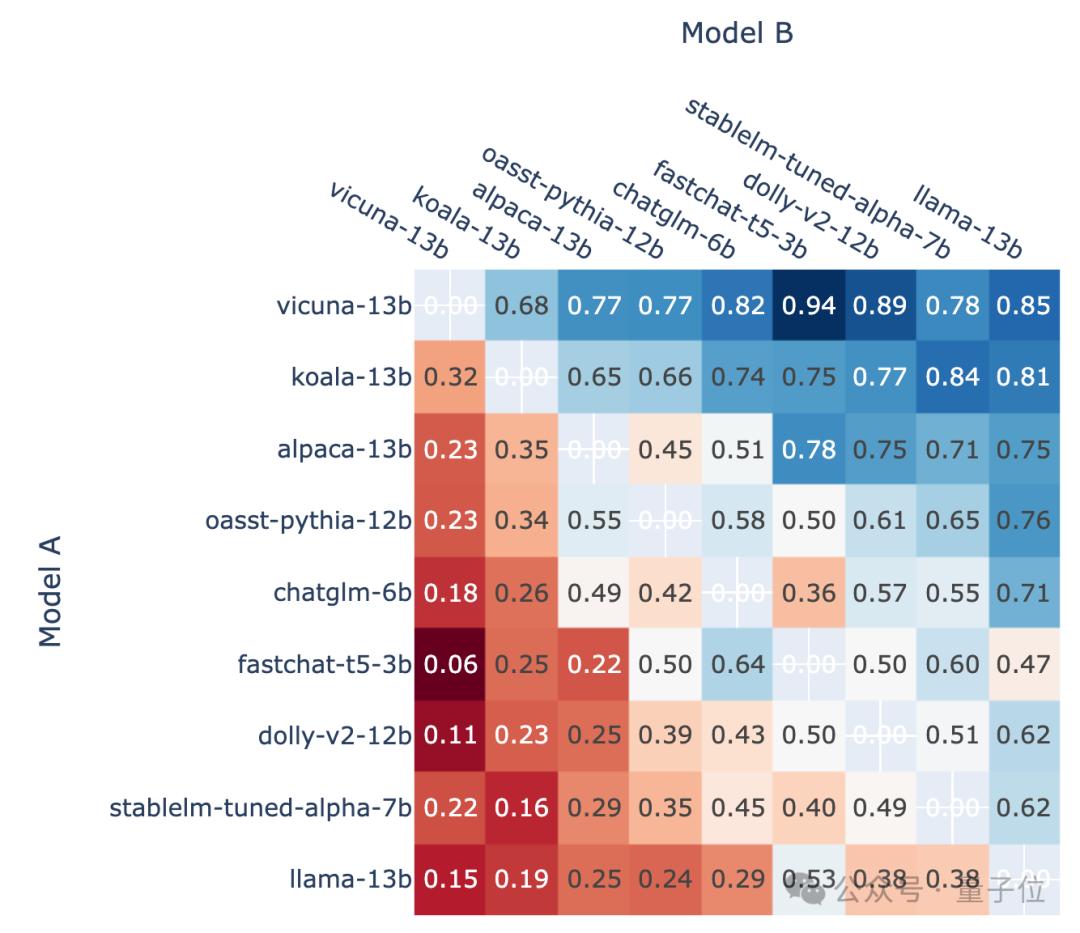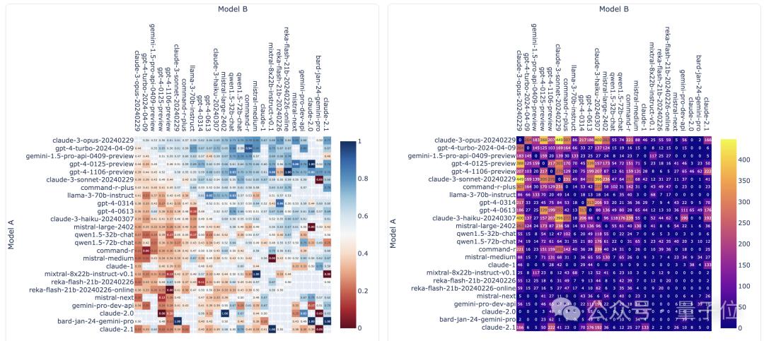 下面这张图展示了部分热门模型的比拼次数和胜率,图中的两项指标都没有统计平局的次数。