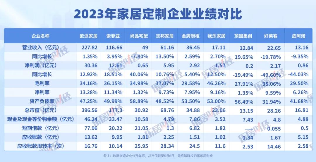 近日,乐居财经对9家已上市家居定制企业的2023年年报数据进行了多维度分析,此次观察和对比的家居定制上市企业分别为欧派家居、索菲亚、尚品宅配、志邦家居、金牌厨柜、我乐家居、顶固集创、好莱客和皮阿诺。