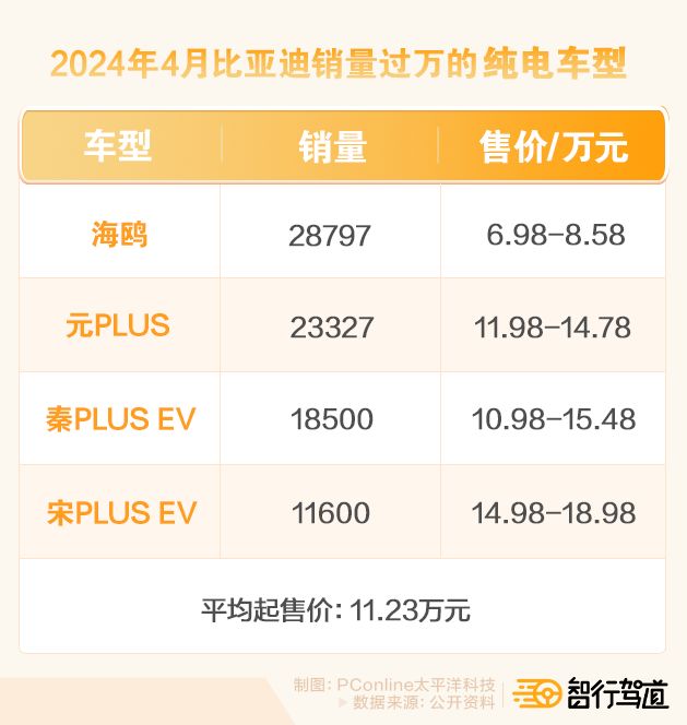 另一方面,目前同级别纯电车成本和售价普遍高于混动车型,例如比亚迪秦PLUS EV的售价就比秦PLUS DM-i高了3万元。但如果以官方售价计算(不考虑销量),4月比亚迪销量破万的4款纯电车平均起售价为11.23万元,而6款混动车平均起售价则是12.48万元。