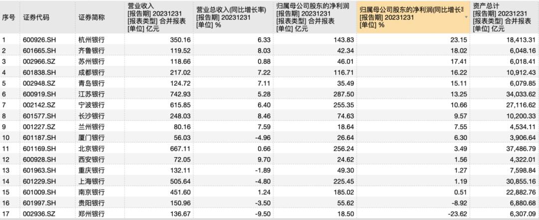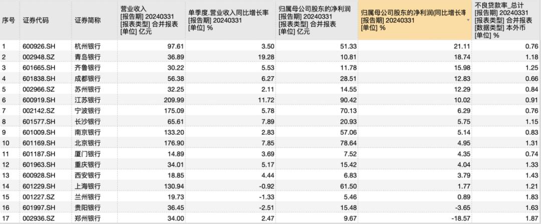 其中,杭州银行、青岛银行、齐鲁银行实现归母净利润51.33亿元、10.81亿元、11.78亿元,同比增长21.11%、18.74%、15.98%。这三家银行位列17家城商行利润增速前三。