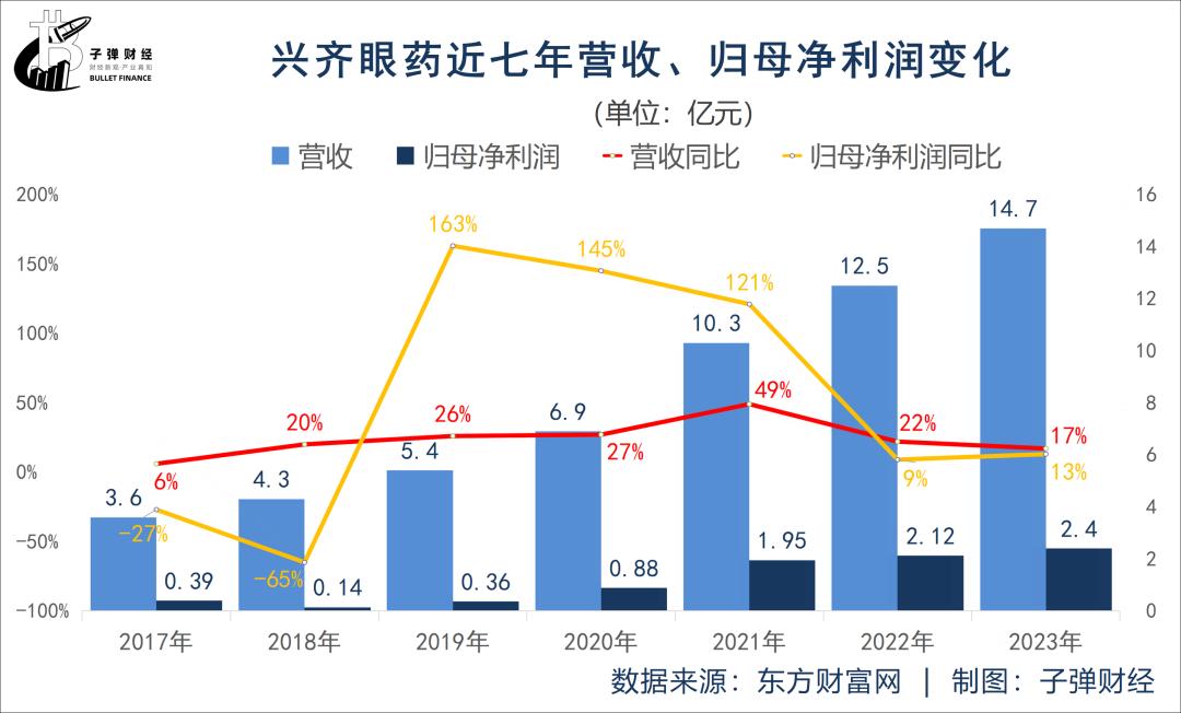 从兴齐眼药最新发布的财报来看,2023年,其营收规模14.68亿元,归母净利润2.4亿元,营收增速已连续两年放缓。