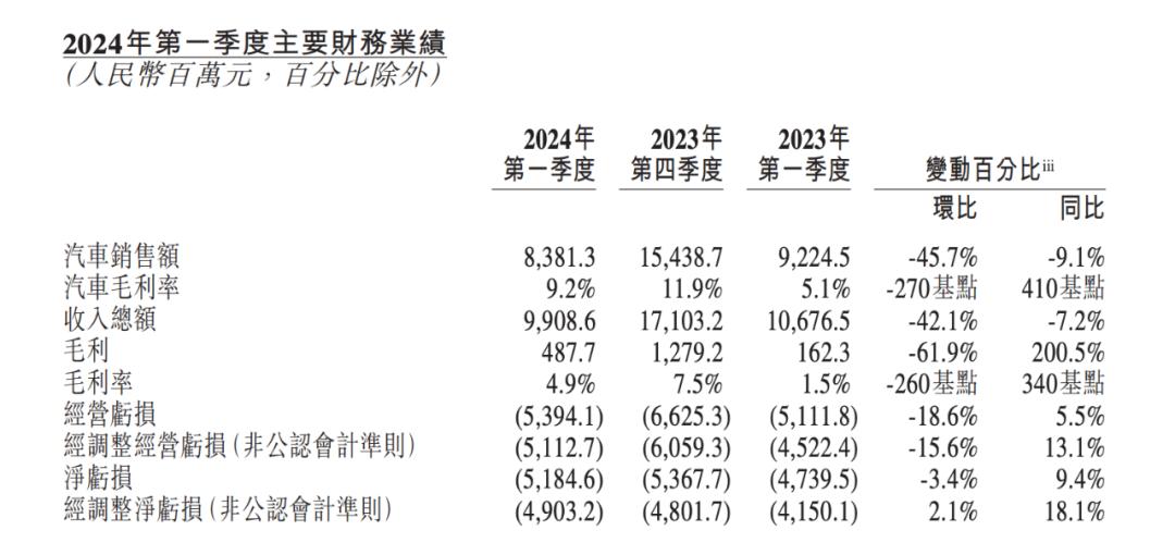 在营收方面,蔚来一季度总营收为99亿元,相比2023年同期的106.77亿元下降了7.2%。一季度毛利为4.8亿元,较2023年同期增长200.5%;一季度毛利率为4.9%,而2023年同期为1.5%。一季度净亏损为51.8亿元,较2023年同期增长9.4%。