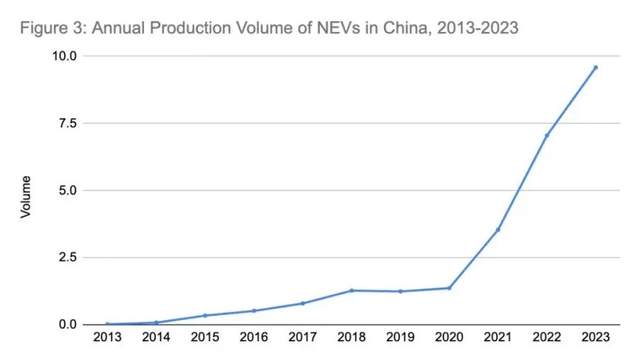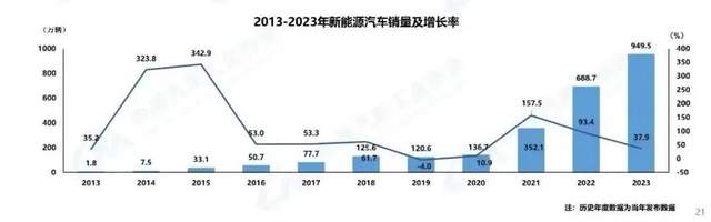 2010年后,中国新能源汽车产量和销量大幅增长,并在2020年后呈现阶梯式的走高。2023年,产量增至958.7万辆,销量为949.5万辆,产销基本持平。同时,新能源汽车的渗透率也呈同样的趋势,今年4月上半月批发、零售渗透率已双双突破50%,2035年的渗透率目标已提前11年完成。