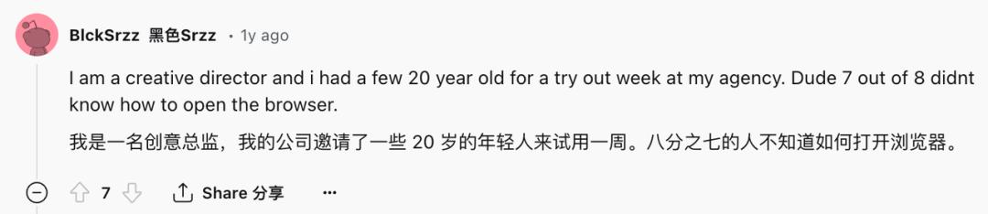 Reddit 上有老哥就说公司请一批 20 岁年轻人来试用,结果八分之七不会打开浏览器;