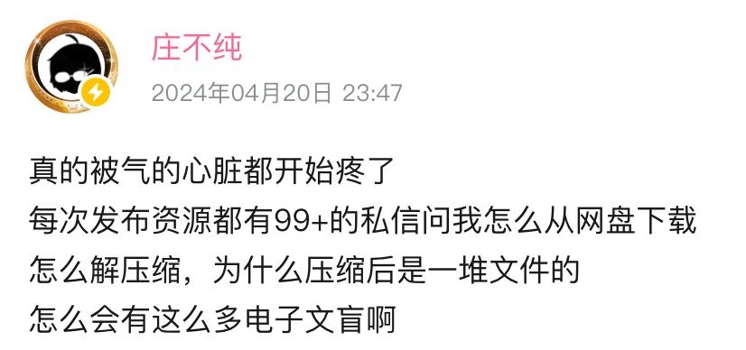 庄不纯表示不理解。。。怎么 自己每次发布资源,都有百来号人问他怎么从网盘下载,怎么解压缩,为什么解压缩后是一堆文件的。