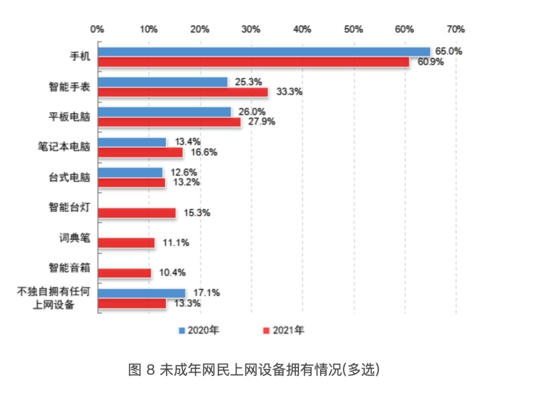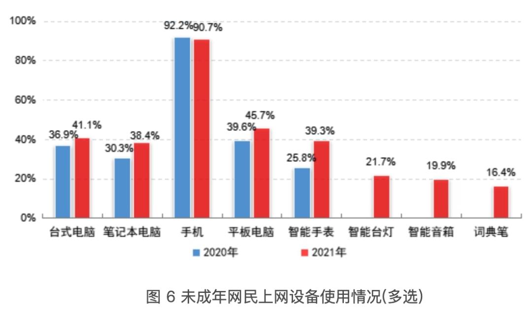《 2021 年全国未成年人互联网使用情况研究报告 》里指出,未成年网民使用的上网设备里,有 90% 是手机上网。台式电脑 / 笔记电脑均只占据 40% 左右。