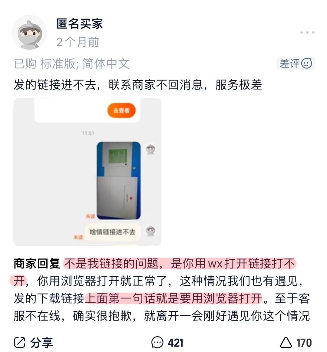 但还是有买家因为 “微信里点不开链接” ,消息回复不及时,给了差评。
