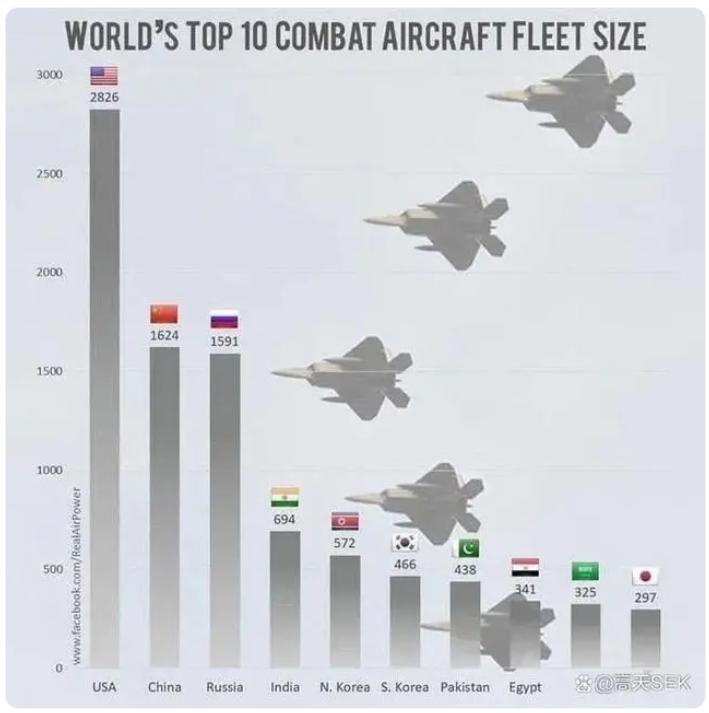 据国外军事网站报道,将海军和空军的战斗机包括在内,在全球战斗机规模排名前10的国家当中,美国以2826架战斗机排名第一,中国紧随其后,战斗机数量为1624架,位居全球第二。五角大楼在2023年“中国军力报告”中宣称,中国空军和海军航空部队总共拥有超过3150架飞机,其中还不包括教练机和无人驾驶飞机。