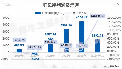 从归母净利润来看,2019-2023年公司归母净利润从490.93万元增长至4504.47万元,CAGR达74.04%;2024年Q1,公司归母净利润达1891.28万元,与上年同期相比增长1461.87%。