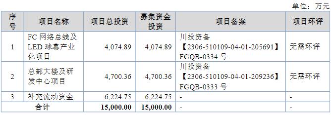IPO募投方面,本次拟募资1.5亿元用于FC网络总线及LED球幕产业化项目、总部大楼及研发中心项目和补充流动资金。