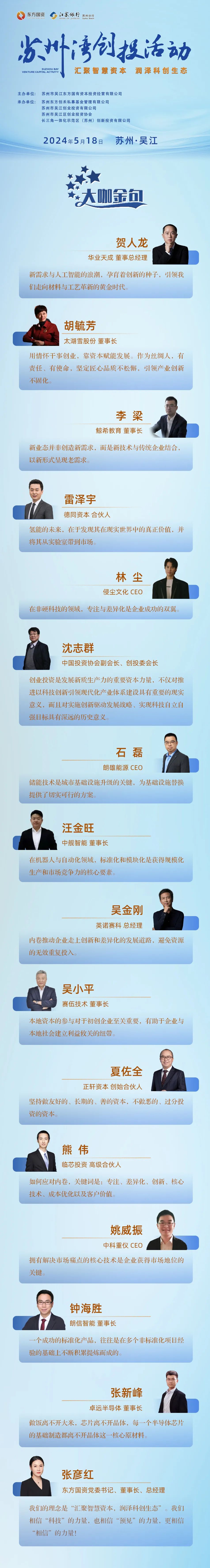 5月18日,以“汇聚智慧资本·润泽科技生态”为主题的苏州湾创投活动成功举办。东方国资旗下品牌“东方创投”重磅亮相,火爆创投圈:近200位来自全国各地的知名创业者与投资人齐聚一堂,共同见证“东方创投”品牌战略发布,“东方创投联盟”成立,“科创森林抚育计划”启动,苏州湾创投壹号全新启航,混沌学园长三角分园、36氪研究院长三角中心揭牌落地,多个合作项目现场签约,成果丰硕。
