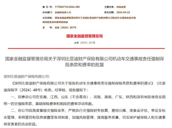 经过一年的布局,比亚迪保险终于于今年5月拿到车险“准生证”。2024年5月6日,国家金融监督管理总局发布公告称,同意比亚迪保险在安徽、江西、山东(不含青岛)、河南、湖南、广东、陕西和深圳地区使用全国统一的交强险条款、基础保险费率和相应的费率浮动系数。这也是继去年11月比亚迪财险车险业务范围被批准后,其车险业务再次获得实质性进展。