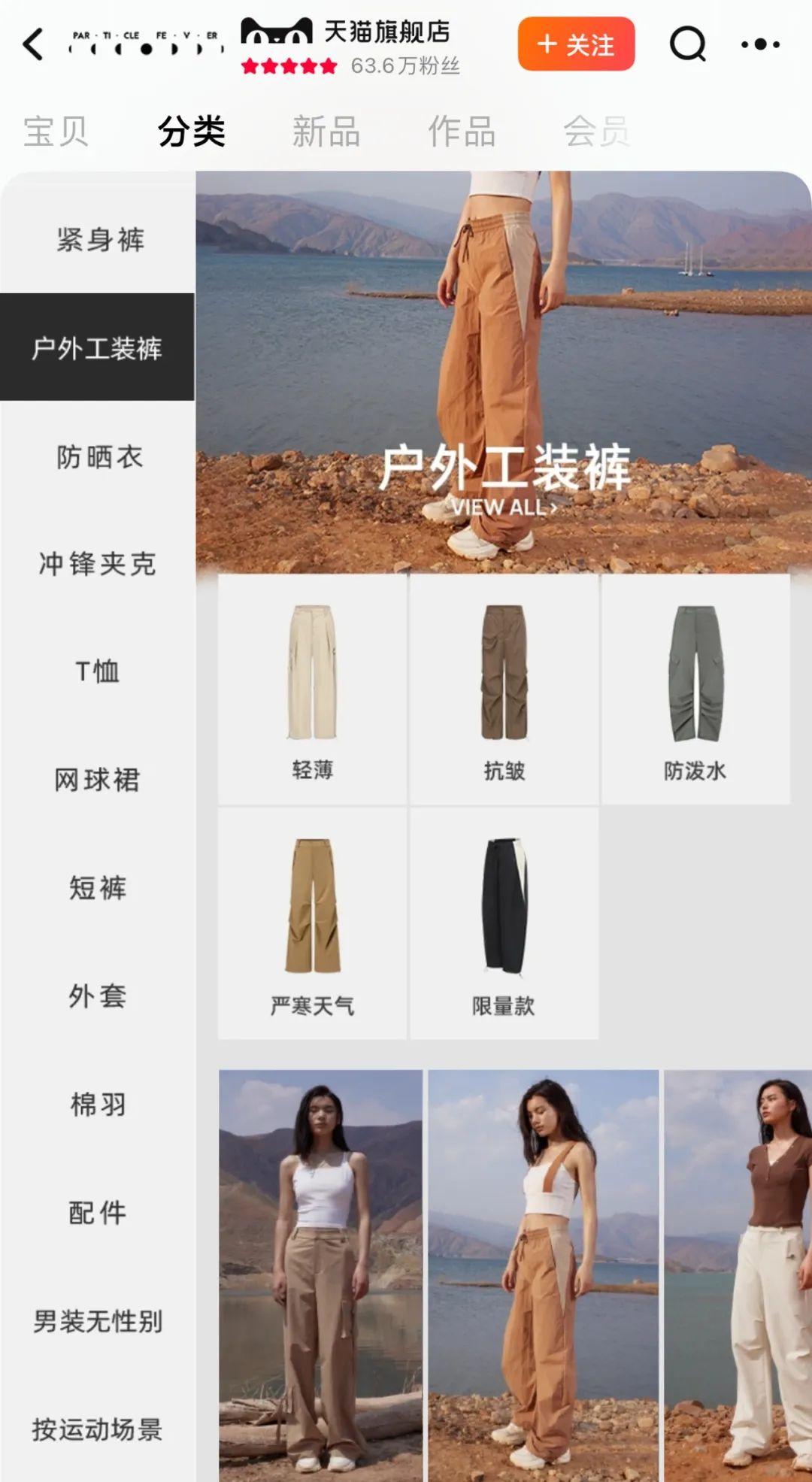 本土女性运动品牌粒子狂热的户外工装裤专区。