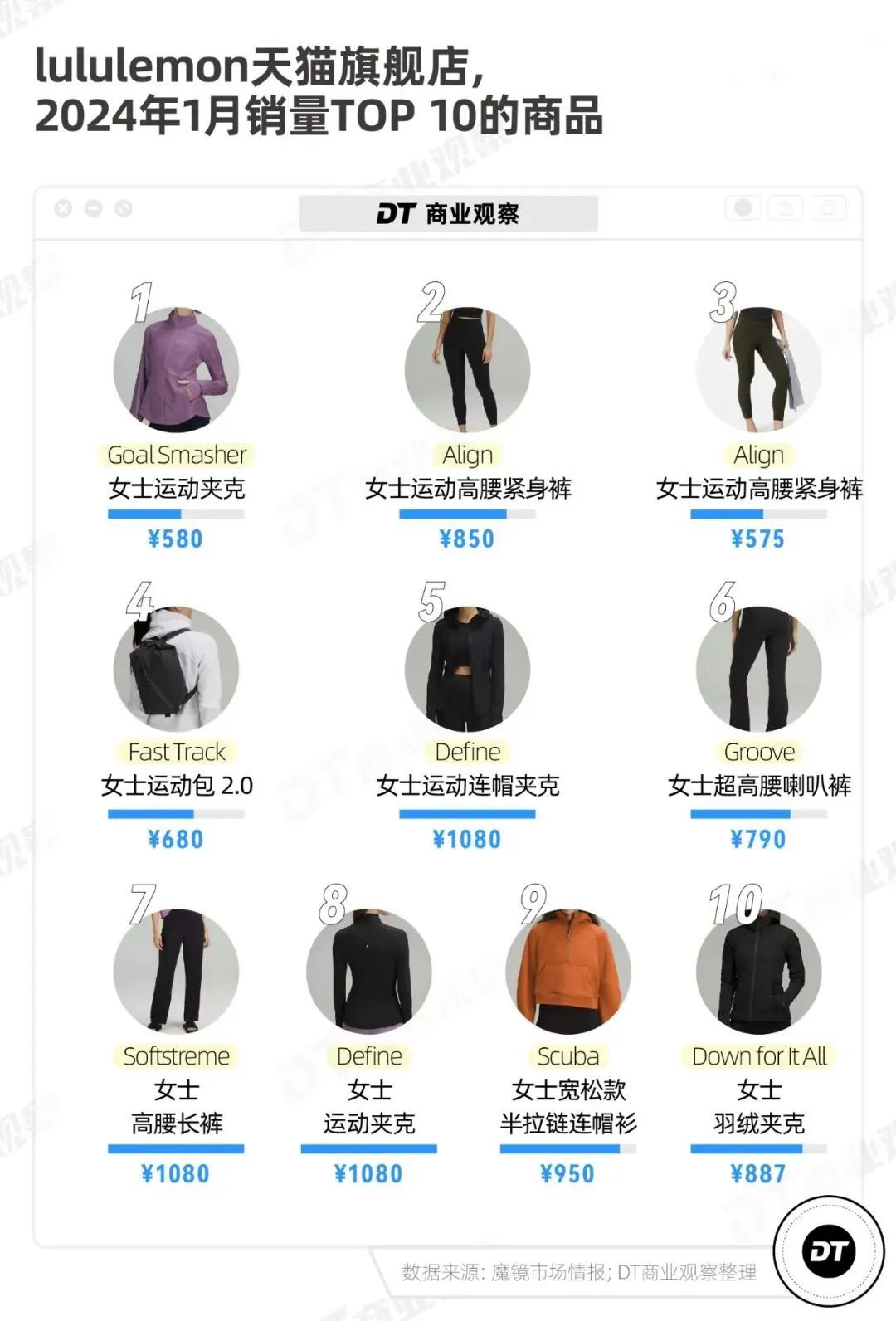 在Alo Yoga的官网上,它特地给宽松卫裤和阔腿裤设立了单独分类,里面的款式并不比瑜伽裤少。至于Lululemon,它也在更多非瑜伽裤产品上暗自发力。在DT商业观察统计的其抖音旗舰店今年1月畅销单品中,它卖最好的裤子包括喇叭裤、高腰长裤和阔腿裤,已却没了紧身瘦腿瑜伽裤的身影。