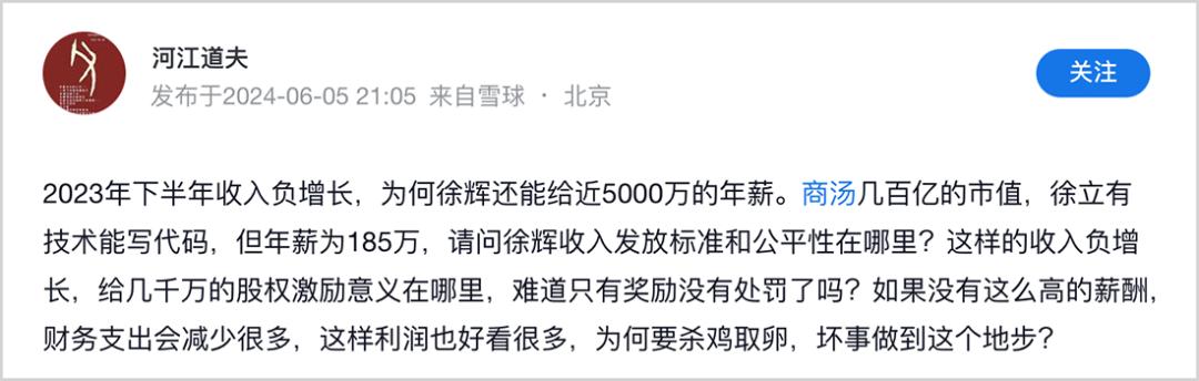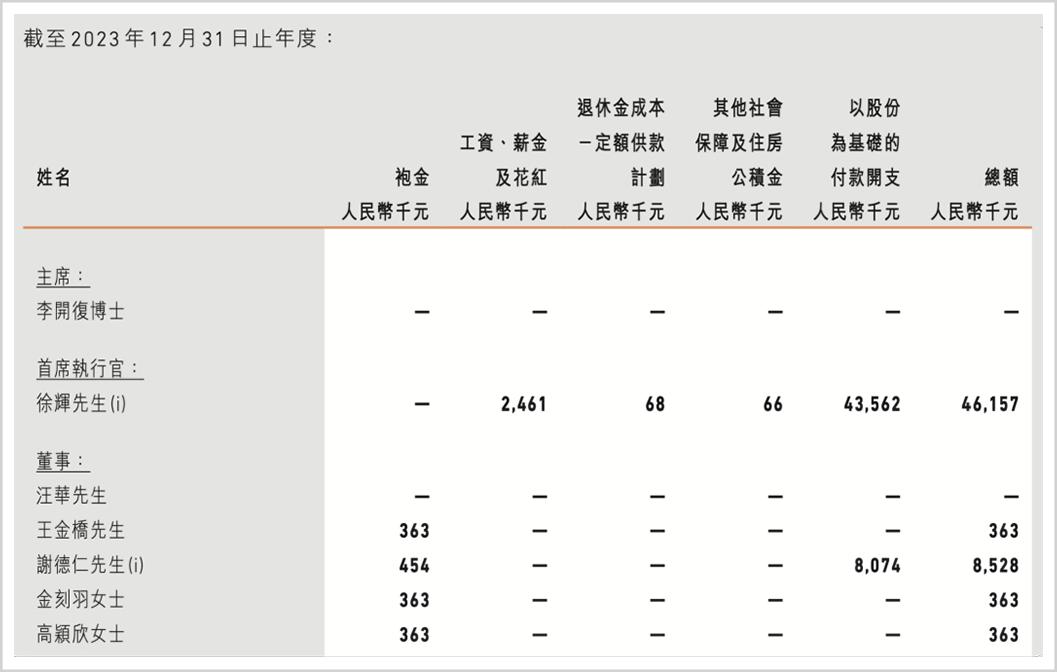 2023年下半年公司收入8.27亿元,无论同比还是环比均出现负增长状况。但令投资人惊讶的是,公司依然给CEO徐辉4356.2万元,给独立非执行董事谢德仁807.4万元的股份激励。