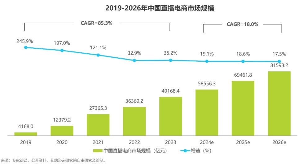 据艾瑞咨询刚刚发布的《2023年中国直播电商行业研究报告》显示,2023年,我国直播电商市场规模高达4.9万亿人民币,增速达到35.2%,并预测未来三年还将保持18%的年复合增长率。100亿,甚至比不过头部达人的年度GMV。