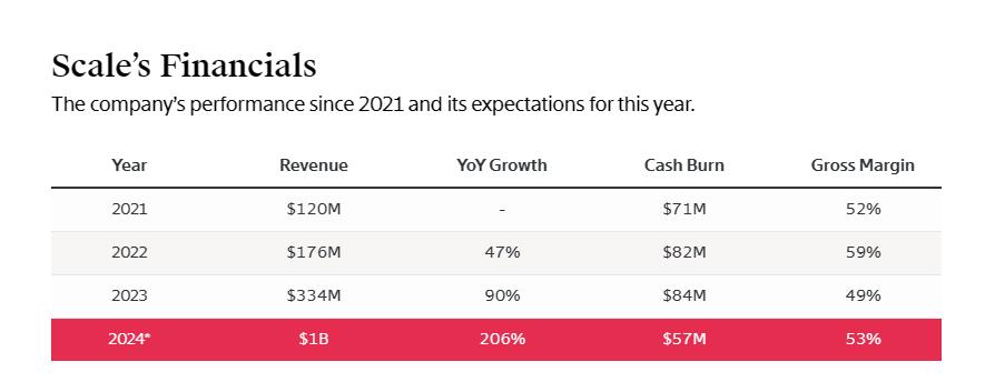 图注:Scale AI自2021年以来业绩表现,今年销售额有望突破10亿美元