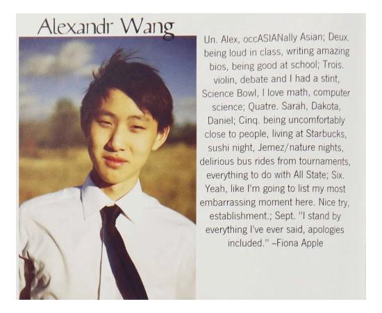 事实上,亚历山大·王在高中时期似乎就感受到自己与同学间微妙的距离感。在毕业纪念册上,他巧妙地借用了歌手菲奥娜·艾普尔(Fiona Apple)的名言:“我坚持我说过的一切,包括道歉。”当同学们纷纷在照片旁记录下自己的尴尬瞬间时,王却以一句“不错的尝试”淡然处之。