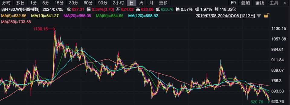 7月4日,券商指数创下5年多来新低;7月5日微涨,但仍在低位徘徊。