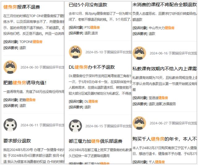 倒闭关门的健身房大多都逃不过资金链断裂的问题,黑猫投诉平台上,关于健身房的投诉记录超过5000条,几乎每一条最终都指向了退款难题。