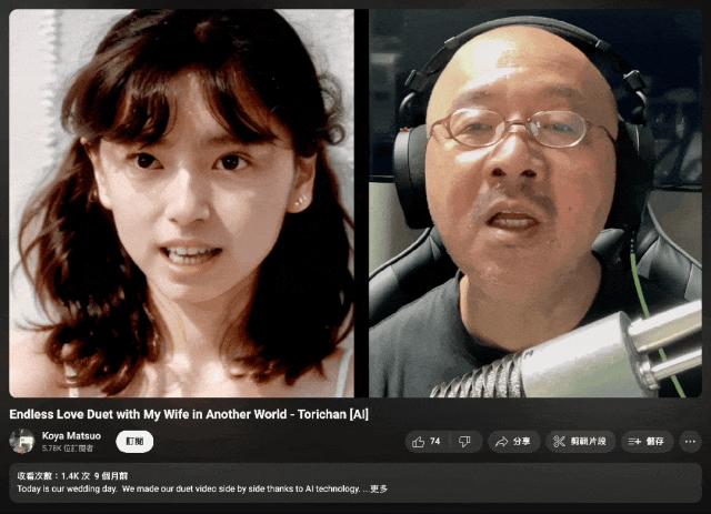 他用 AI 技术修复了 1987 年与小鸟酱的老照片,并训练 AI 生成她的角色,还用 DID 制作了小鸟酱的视频,在婚礼纪念日上实现了他们十年前想合唱的愿望。