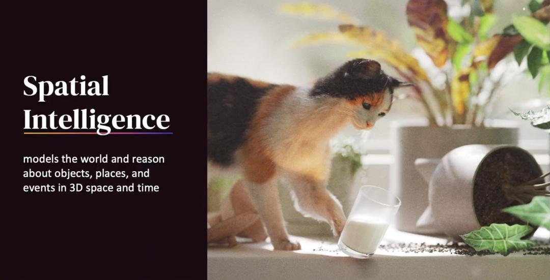 为了说明空间智能的概念,她指向了一张猫推倒玻璃杯的图片。她解释道:“在最后一瞬间,你的大脑看到了这个玻璃杯的几何形状,它在三维空间中的位置,它与桌子、猫及其他一切的关系,并且你可以预测接下来会发生什么。”