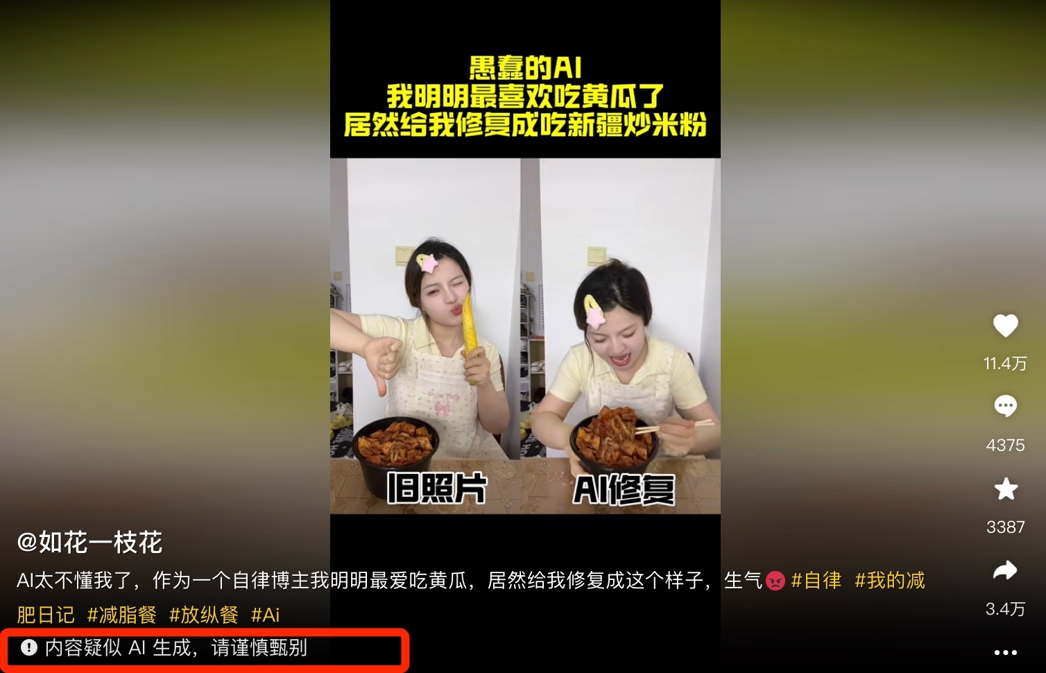 本来减肥时要吃的黄瓜,“AI生成”之后,变成了香喷喷的新疆炒米粉。