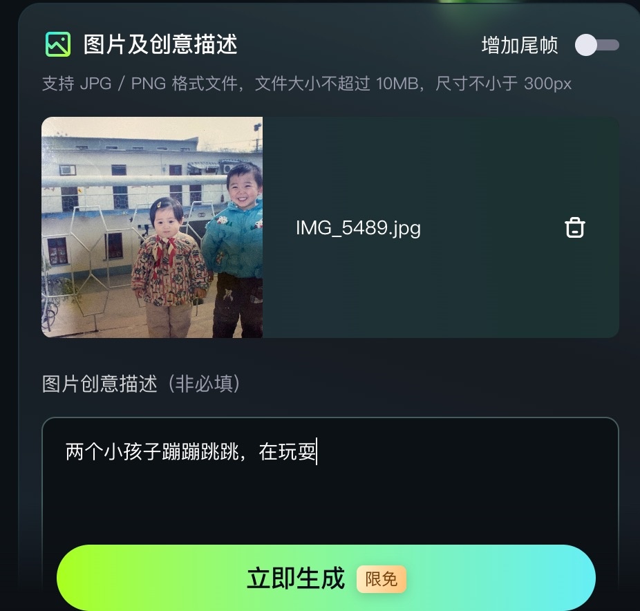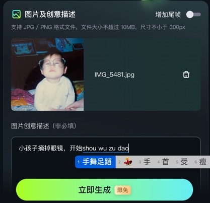 上传后,在【图片创意描述】中,输入自己想要生成的动作。