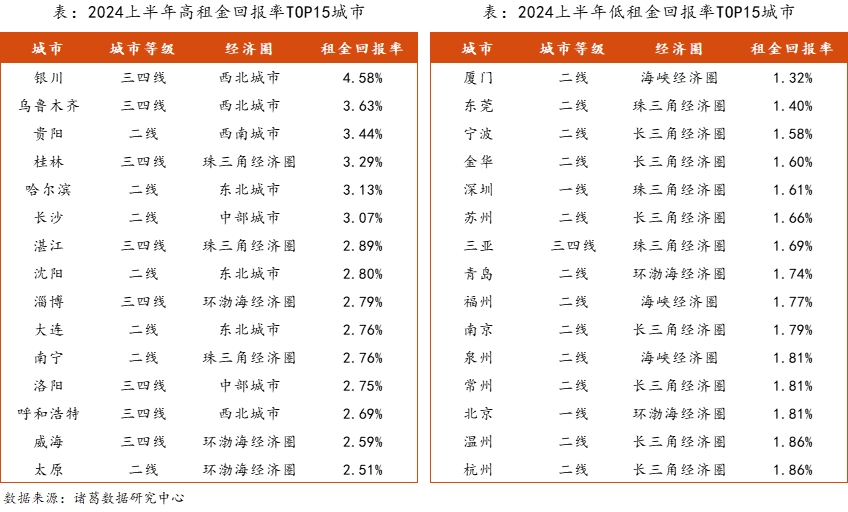 上半年高租金回报率城市TOP15和低租金回报率城市TOP15