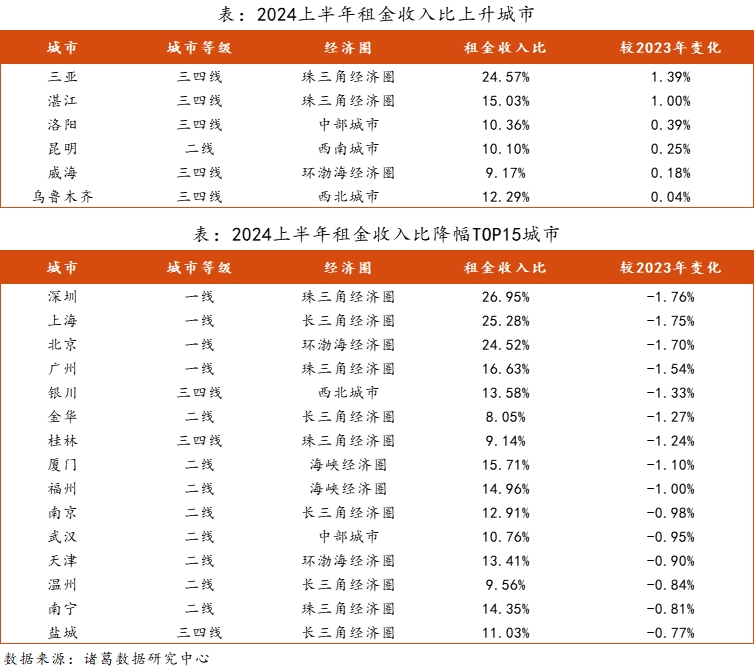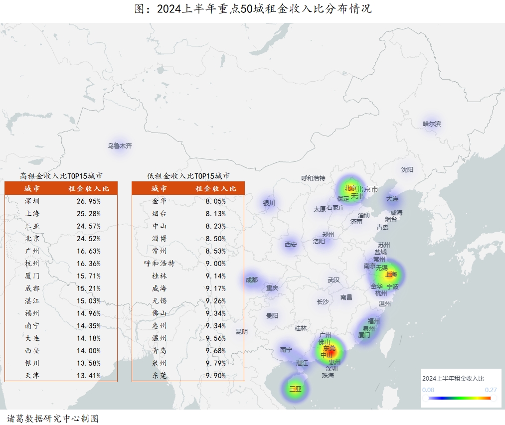 2024年上半年,国内租房支出压力最大的4个城市分别为:深圳、上海、三亚、北京,它们的租金收入比均超过20%,但不超过30%。