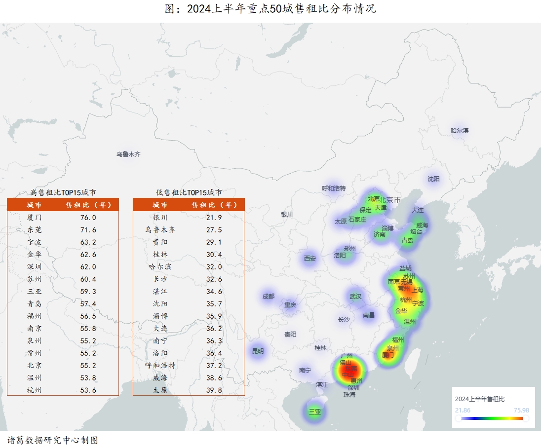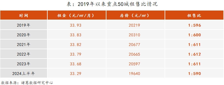 在诸葛数据研究中心的监测数据中,2024上半年重点50城平均租金为33.29元/㎡/月,较2023年下降1.18%;平均房价为19640元/㎡,较2023年下降4.65%,房价降幅超过租金降幅,房价租金偏离程度已经连续2年缩小,回到了2019年的水平。