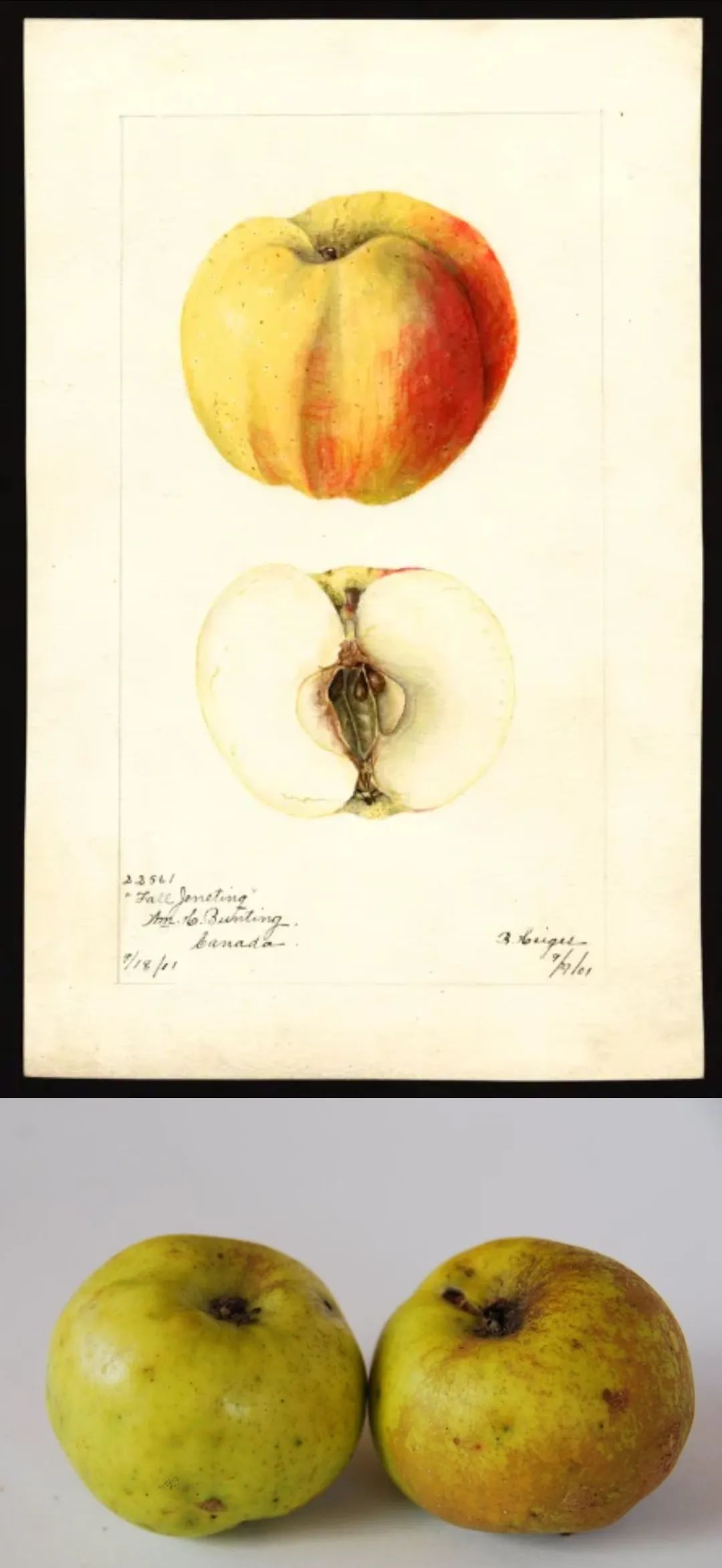古书和现实中的“秋天的詹尼廷”苹果,这种形状奇特的苹果在 19 世纪被认为是最适合罐装和烹饪的苹果品种,但自 20 世纪初以来已失传。戴夫于 2014 年左右在华盛顿州东部重新发现了这种苹果(图片来源:montezumaorchard.org&mofga.org)