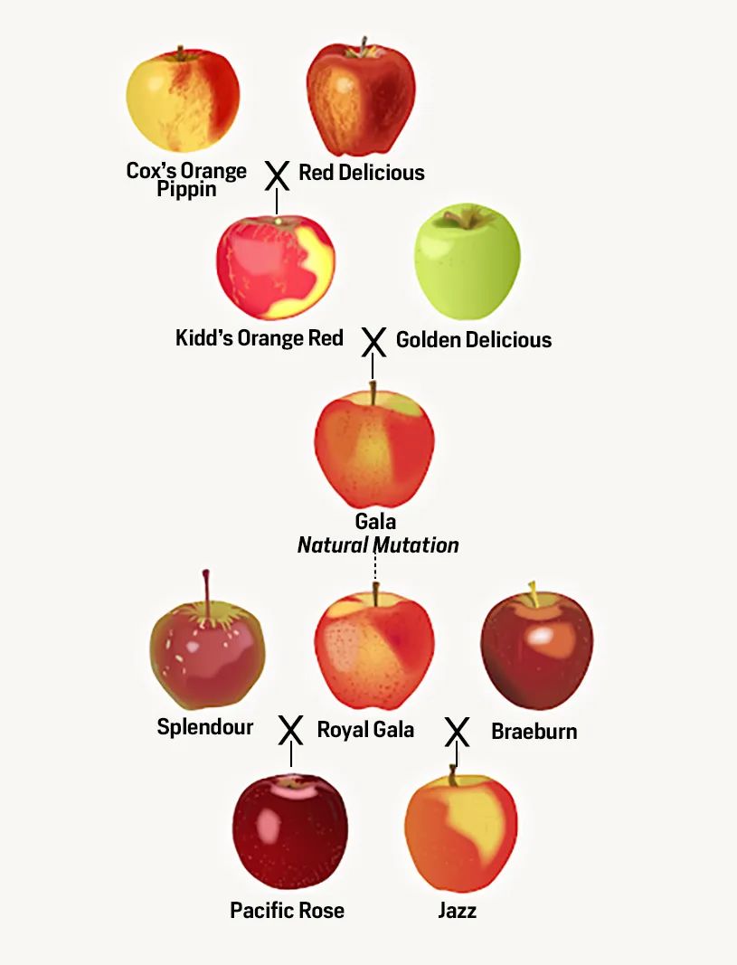 “爵士”苹果品种家族树,这是在新西兰受欢迎的一个苹果品种。由于苹果“异花授粉”的属性,所以想搞清楚一个品种的起源并不容易(图片来源:thinkport.org)
